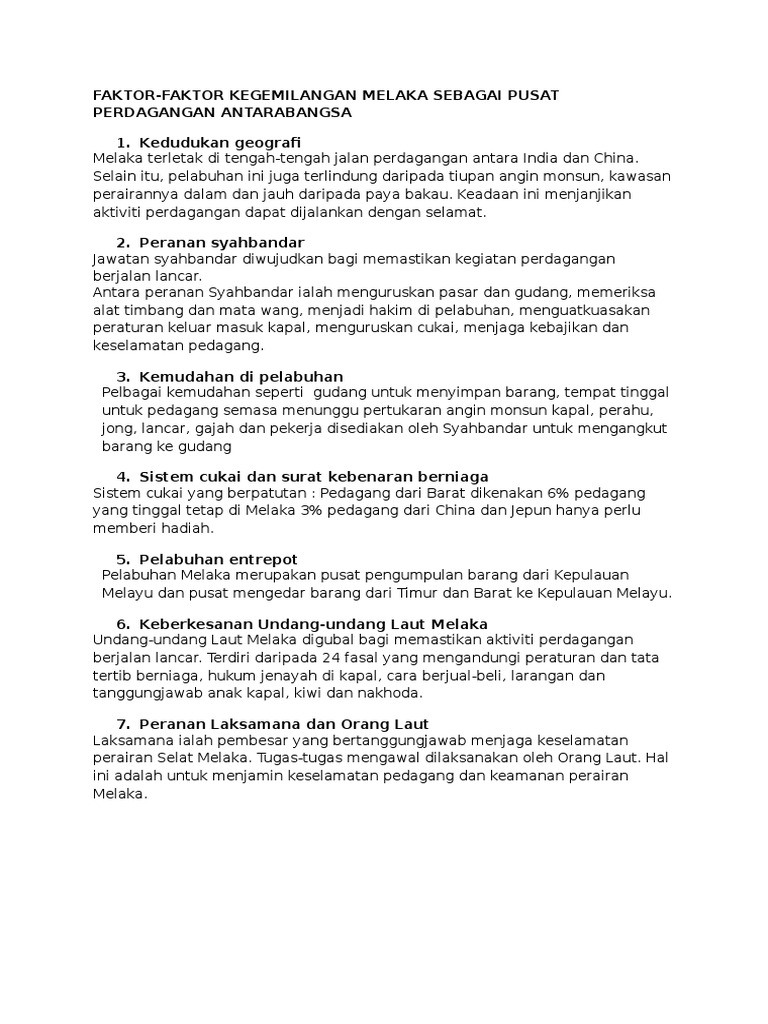 View 252591874-Faktor-faktor-Kegemilangan-Melakapdf from ACCOUNTING FAR 618 at MARA University of Technology. Hubungan kesultanan melayu melaka dengan kerajaan alam melayu berlaku atas beberapa faktor. Bincangkan Faktor-faktor Kemunculan Melaka Sebagai Pusat Perdagangan Di Asia Tenggara DiAlam Melayu Pada Abad Ke 15 Maeshi Pengenalan.